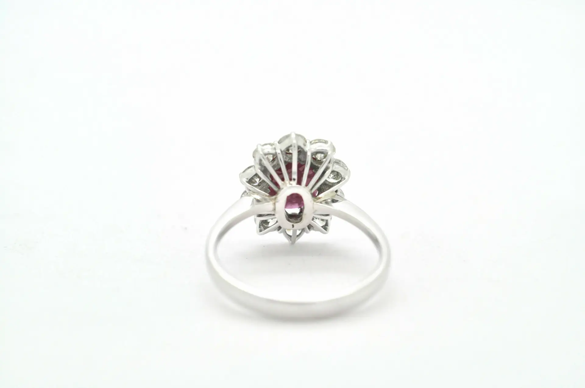 Meraviglioso anello con rubino e diamanti, in oro bianco 18 carati di grammi 4,5.