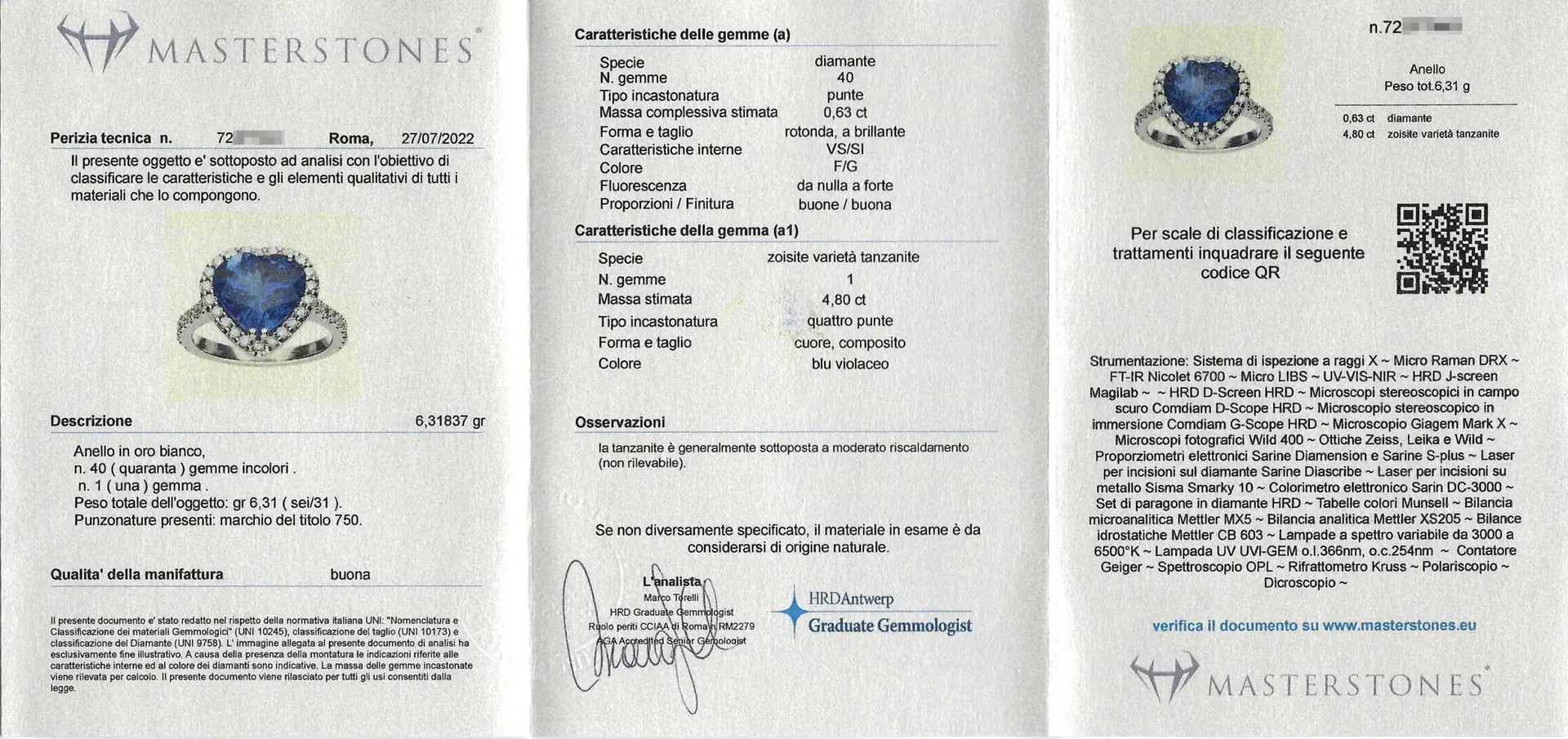 Splendido anello, misura 12-52, in oro bianco 18 kt (750/000) dal peso di 6,3 grammi, impreziosito da una tanzanite taglio cuore da 4,80 carati, dal colore intenso e profondo. La gemma centrale è valorizzata da un contorno di diamanti taglio brillante rotondo per un totale di 0,63 carati, con colore G e purezza VS. L’equilibrio tra eleganza e luminosità rende questo gioiello un pezzo unico e raffinato. Accompagnato da certificato gemmologico Masterstones che ne attesta qualità e autenticità.