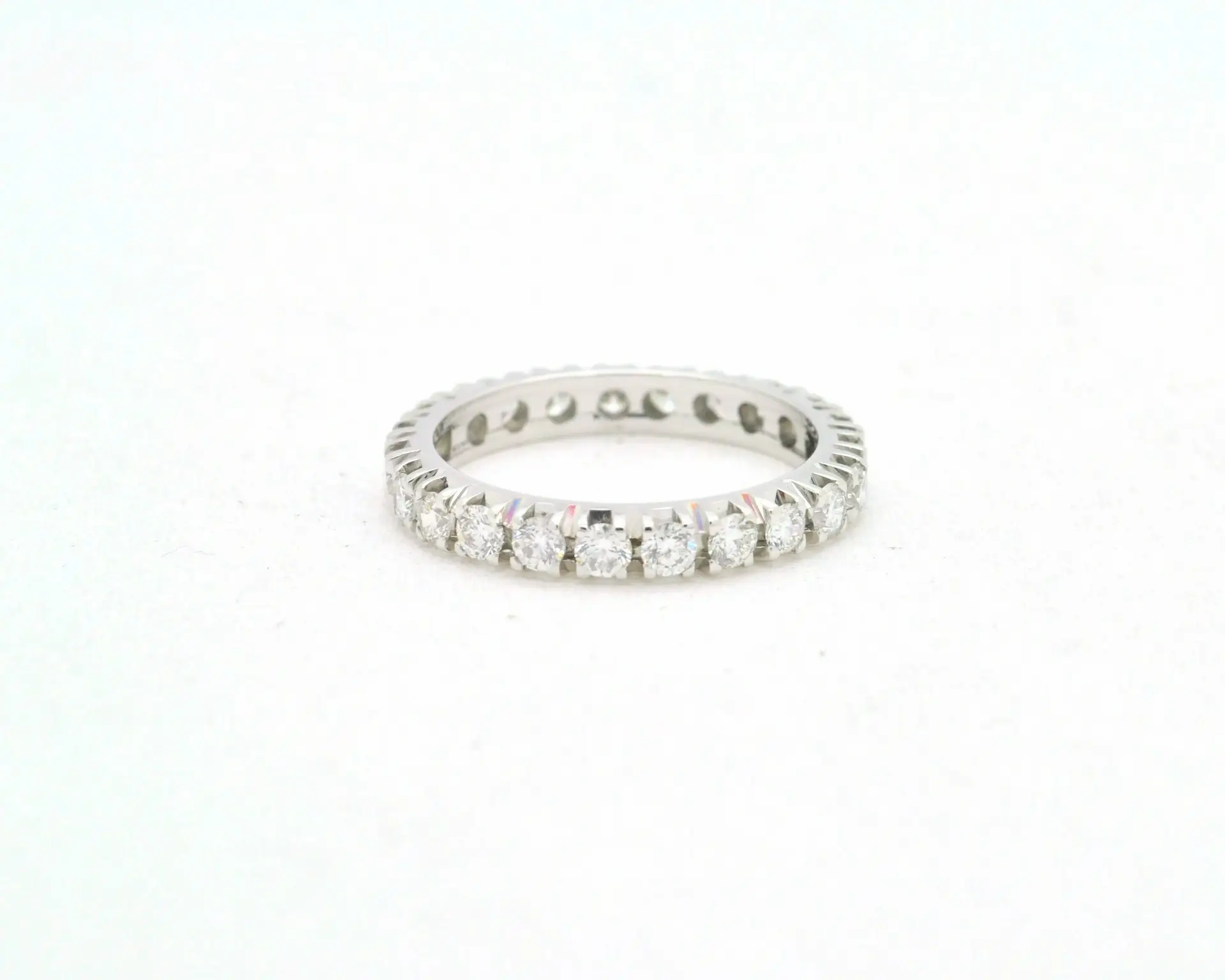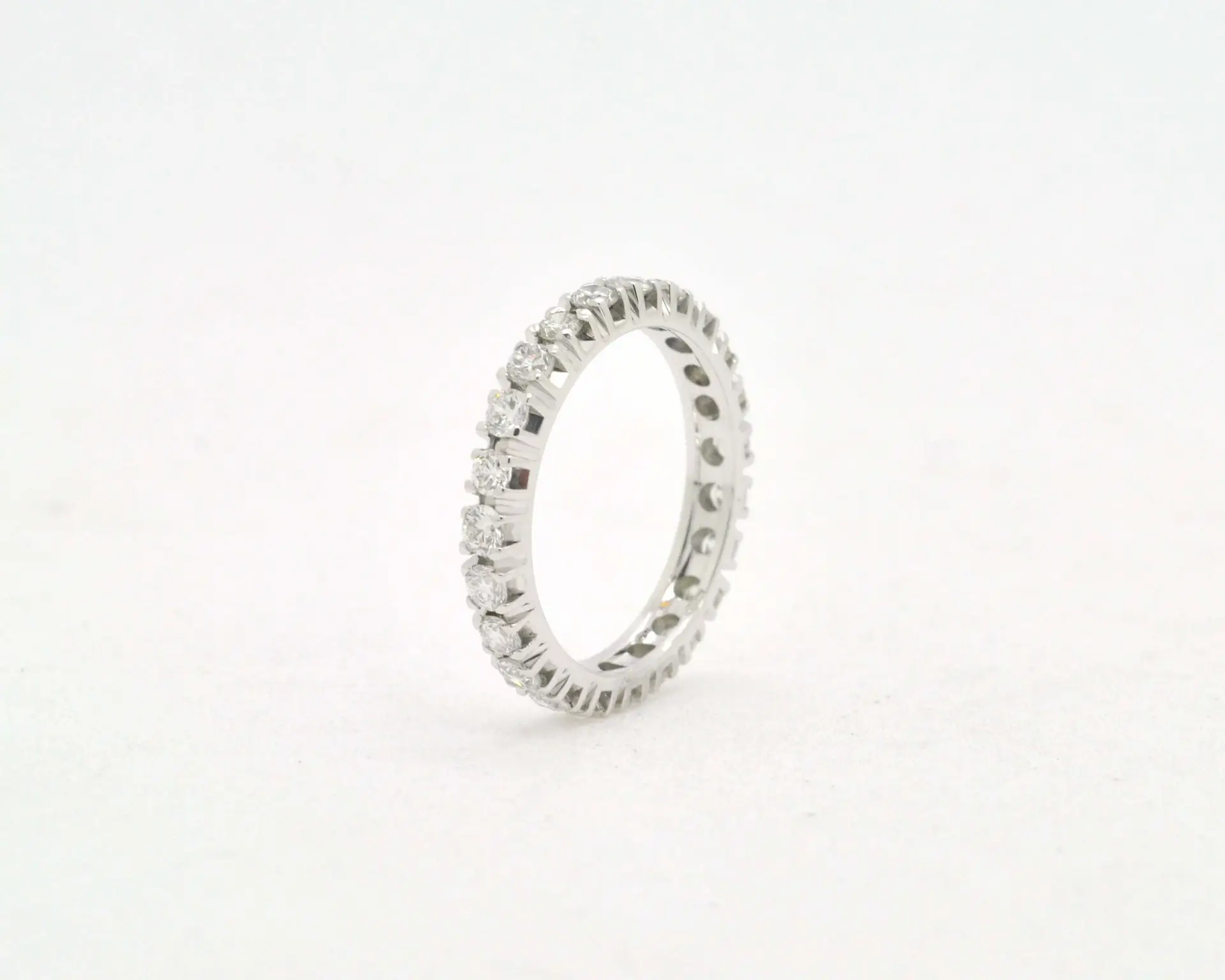 Elegante anello eternity realizzato in oro bianco 18 carati (750/000), dal peso di 3 grammi. È impreziosito da diamanti naturali per un totale di 0,92 carati, con colore G e purezza VS. Un simbolo di eternità e amore senza fine, perfetto per celebrare un legame speciale con stile e luminosità.
