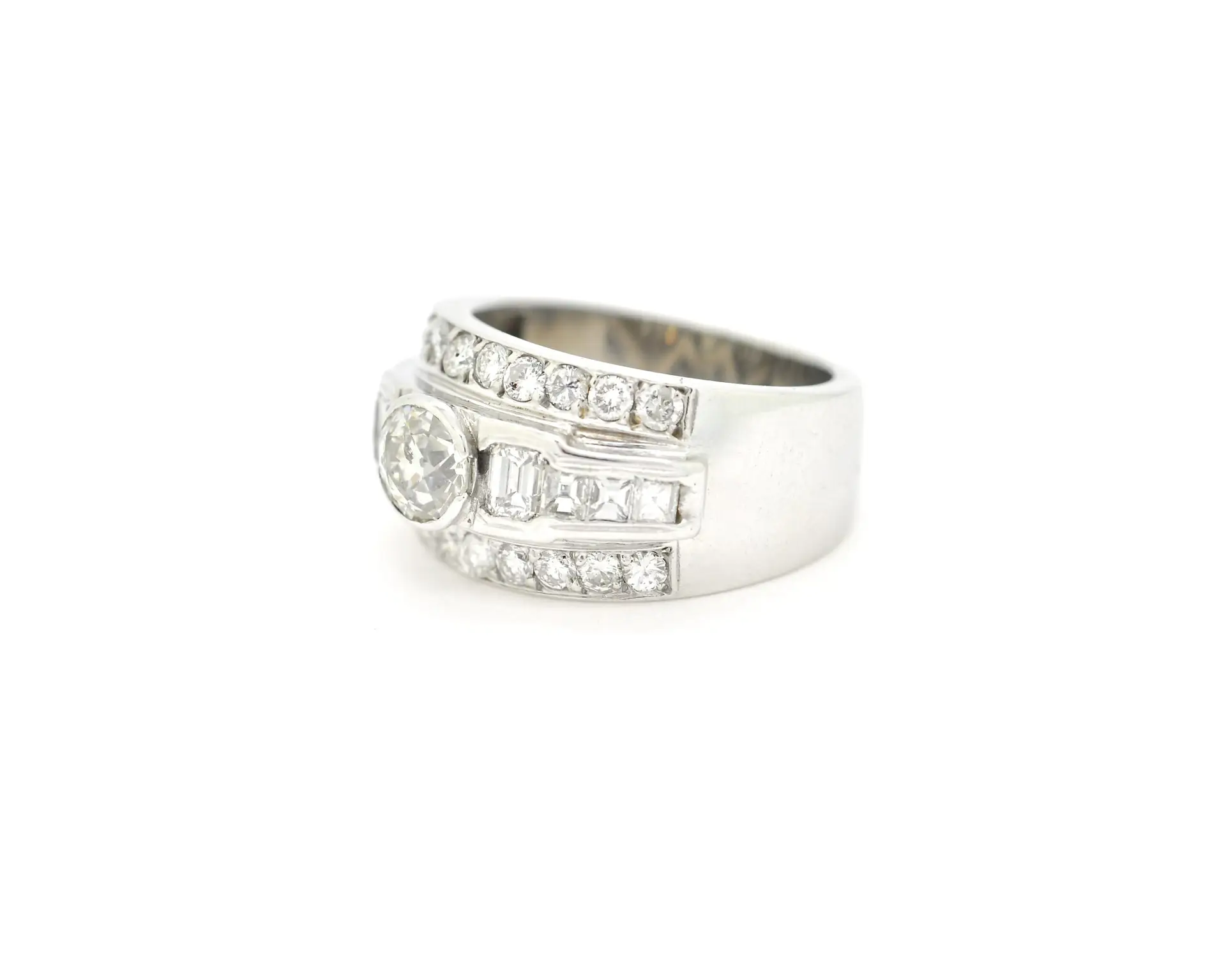 L’anello monta un bellissimo diamante centrale taglio Vecchia Europa da 0,75 carati stimati, lateralmente ha dei diamanti taglio baguette e taglio princess e su entrambi i lati dell’anello dei diamanti taglio brillante, per una caratura totale del pavè di 1,20 carati stimati.