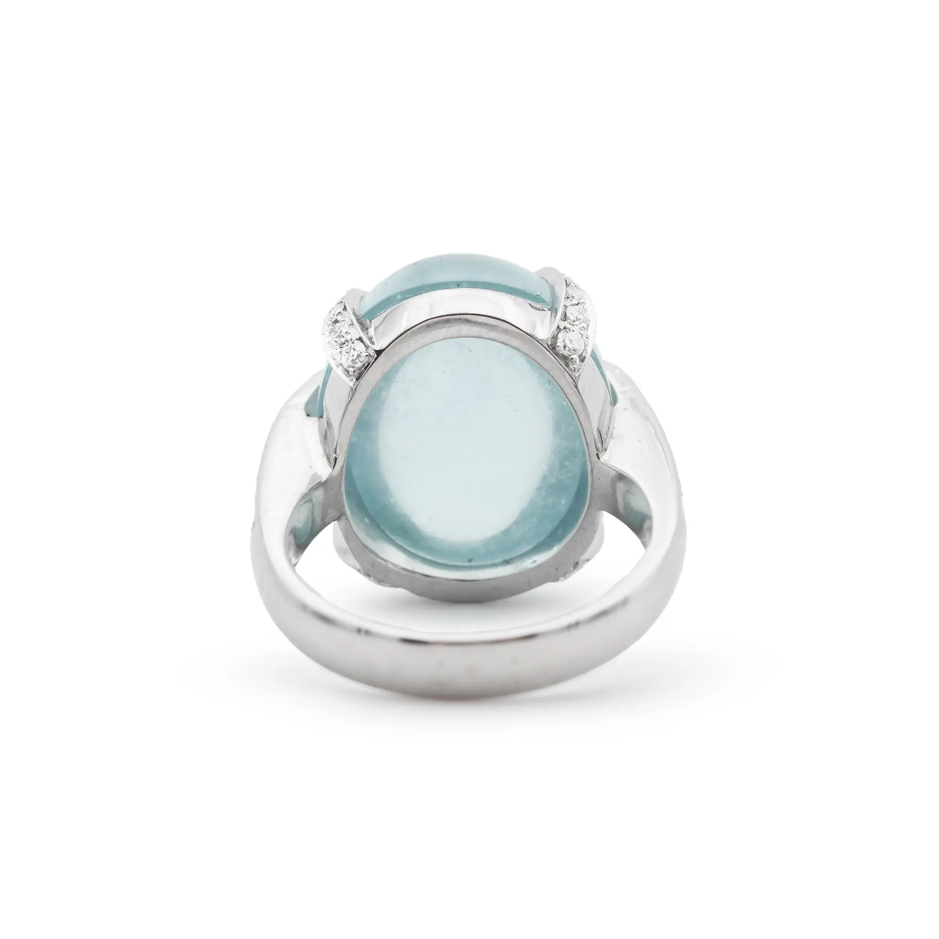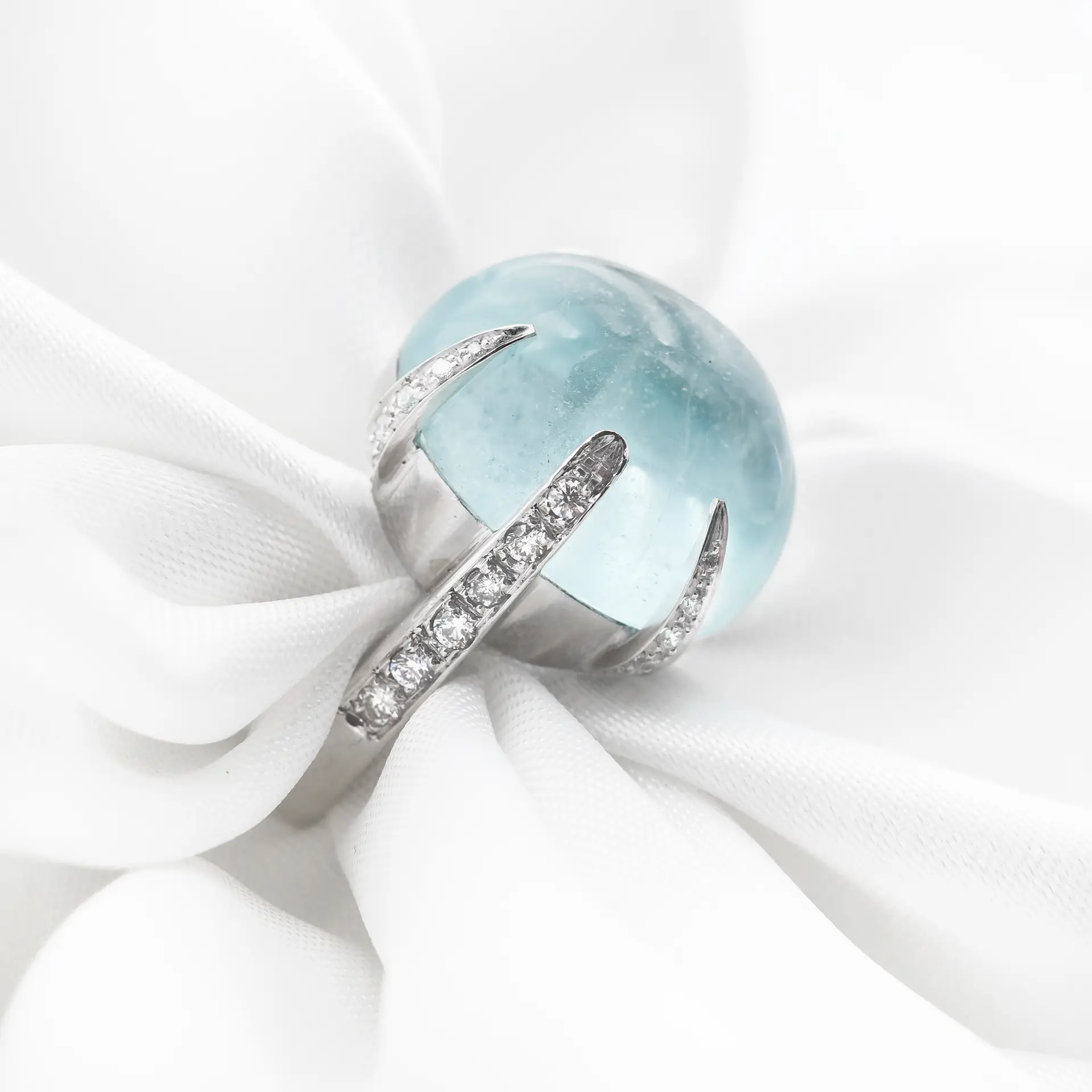 Elegante anello in oro bianco 18 carati (750/000), dal peso di 11,3 grammi, impreziosito da una magnifica acquamarina da 18,5 carati, esaltata da diamanti per un totale di 0,40 carati. La purezza dell’azzurro si fonde con la luce dei diamanti in un gioiello di grande raffinatezza e impatto visivo. Misura 13, con possibilità di messa a misura senza comprometterne l’estetica. Un accessorio esclusivo, pensato per chi ama distinguersi con classe.