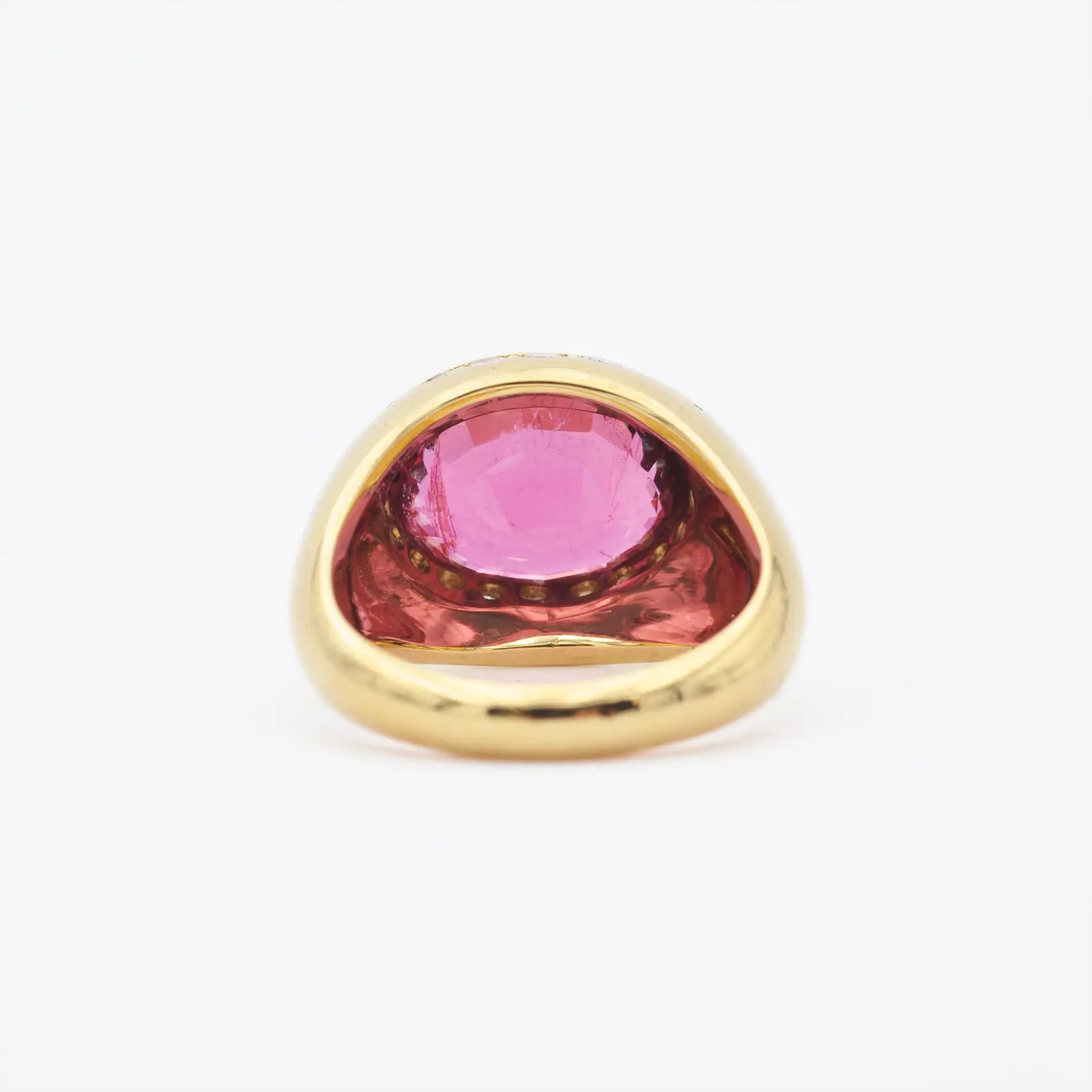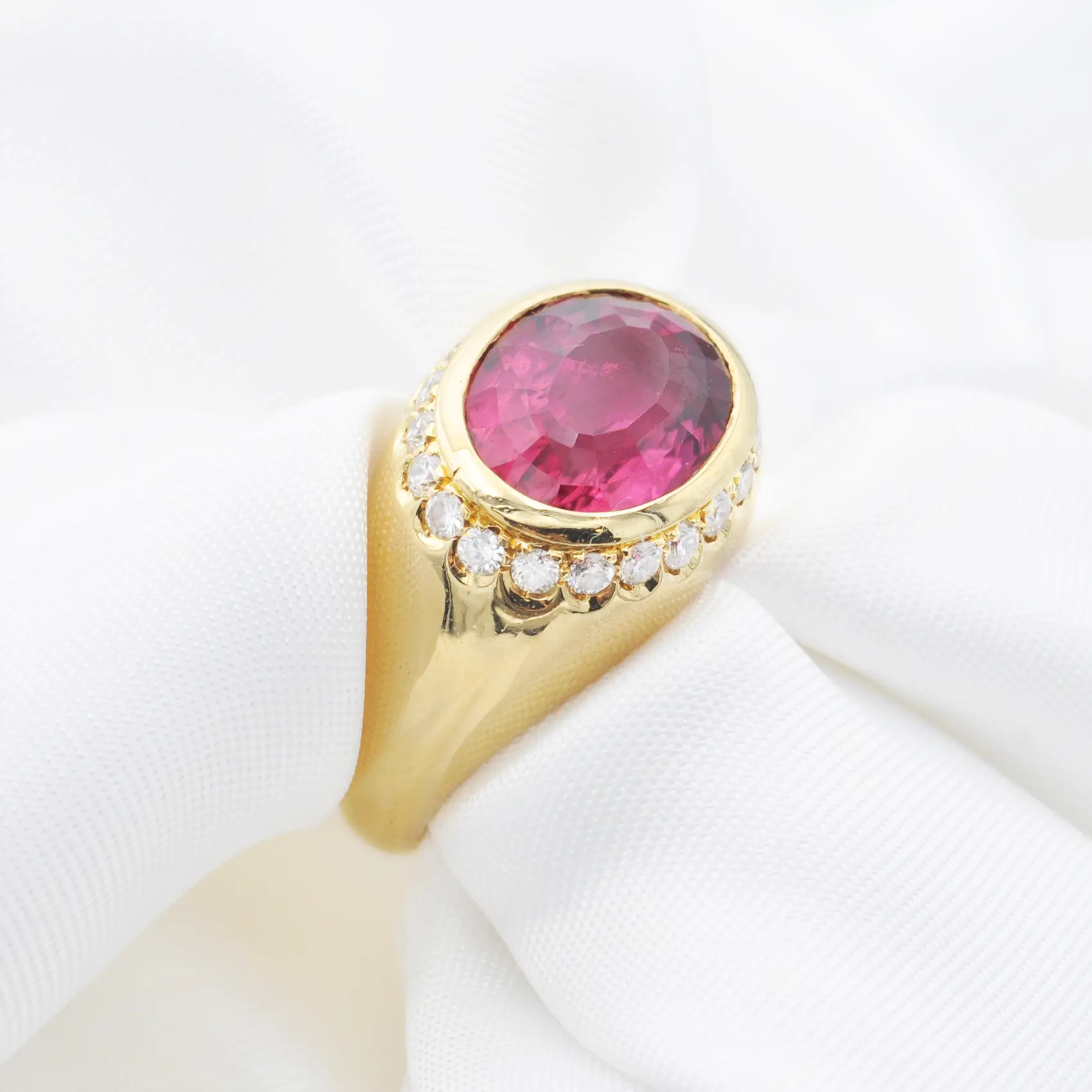 Elegante anello in oro giallo 18 carati (750/000), con un peso di 15 grammi e una splendida rubellite centrale da 7,20 carati con taglio ovale. Accentuato da diamanti brillanti da 0,70 carati (colore G, purezza VVS1), questo gioiello è un simbolo di lusso e raffinatezza. Il certificato gemmologico attesta l’autenticità delle gemme, rendendolo una scelta ideale per chi cerca un pezzo unico e prezioso. Perfetto per ogni occasione speciale.