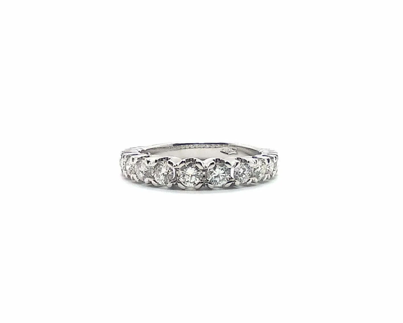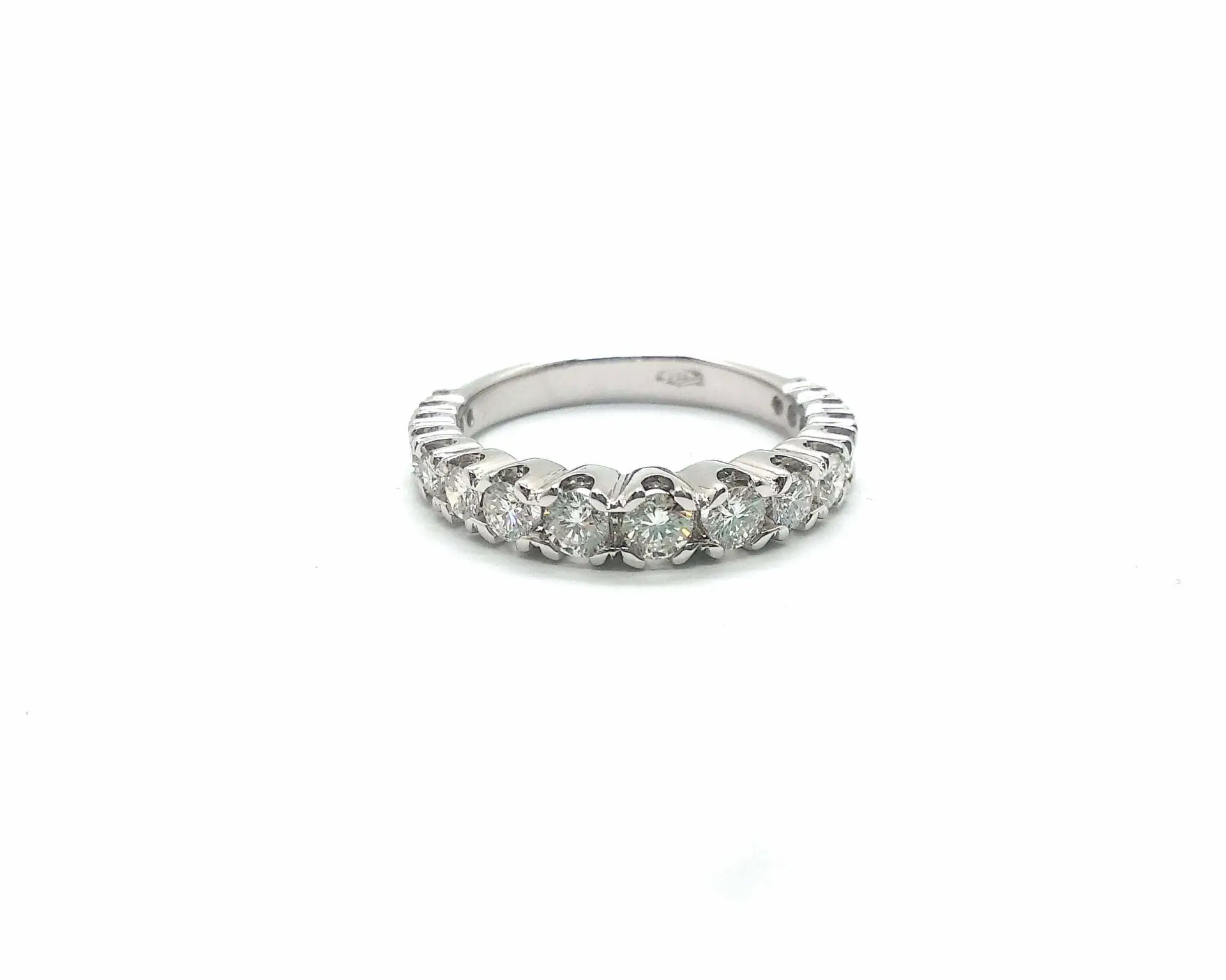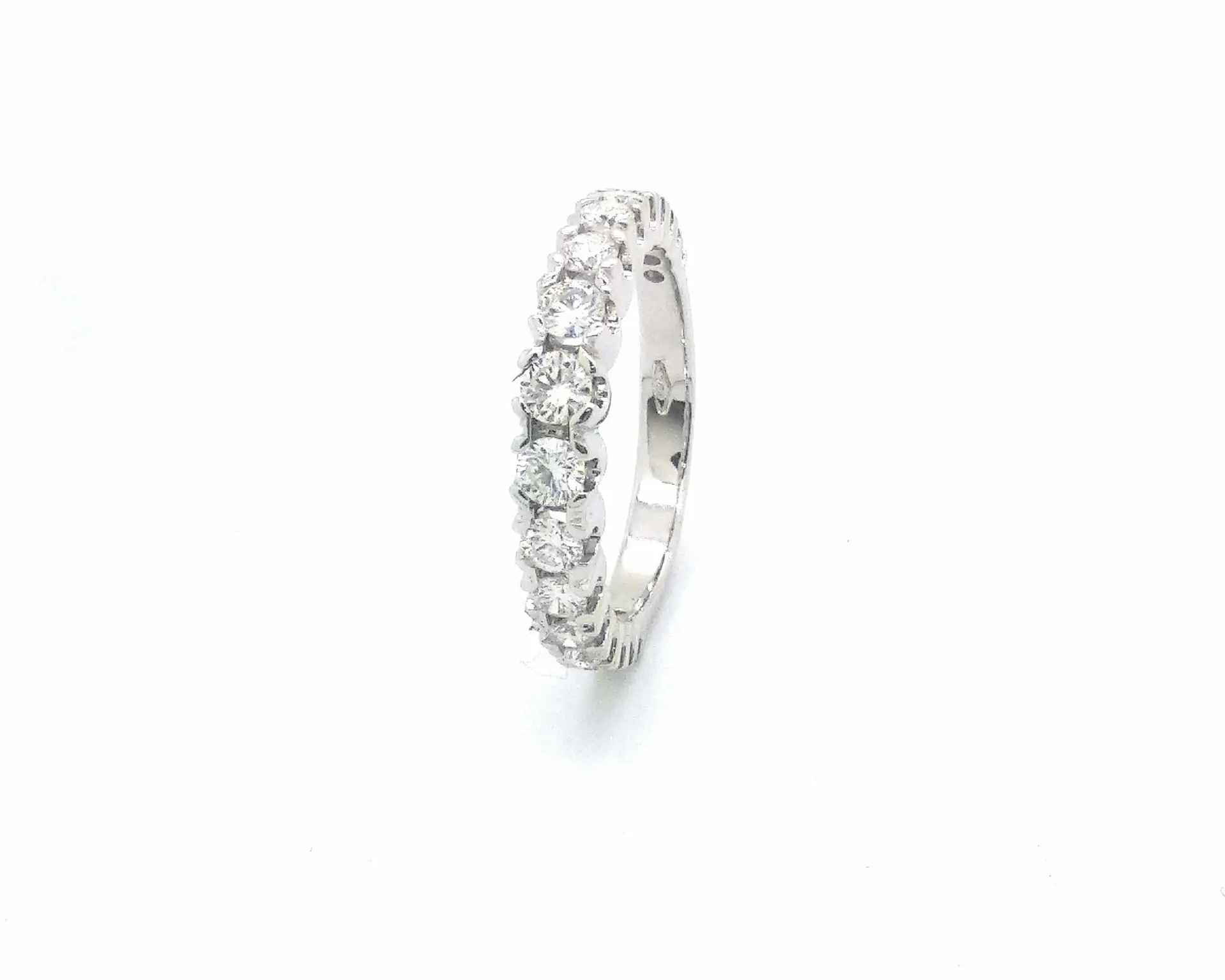 Anello veretta “degradante” in oro bianco CT 750, peso gr. 3,7. Con diamanti di CT complessivi 0,86 di colore G e purezza Vs.