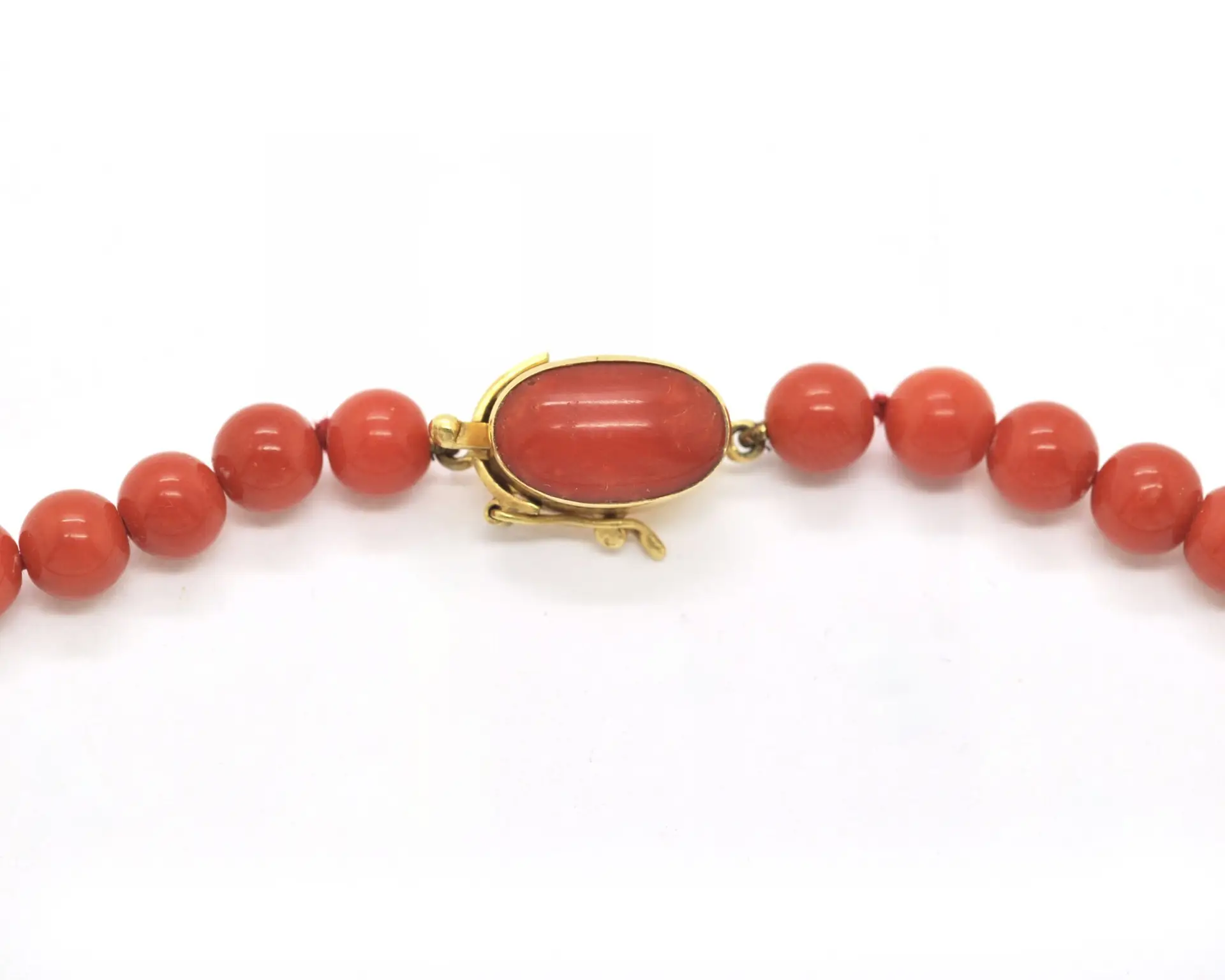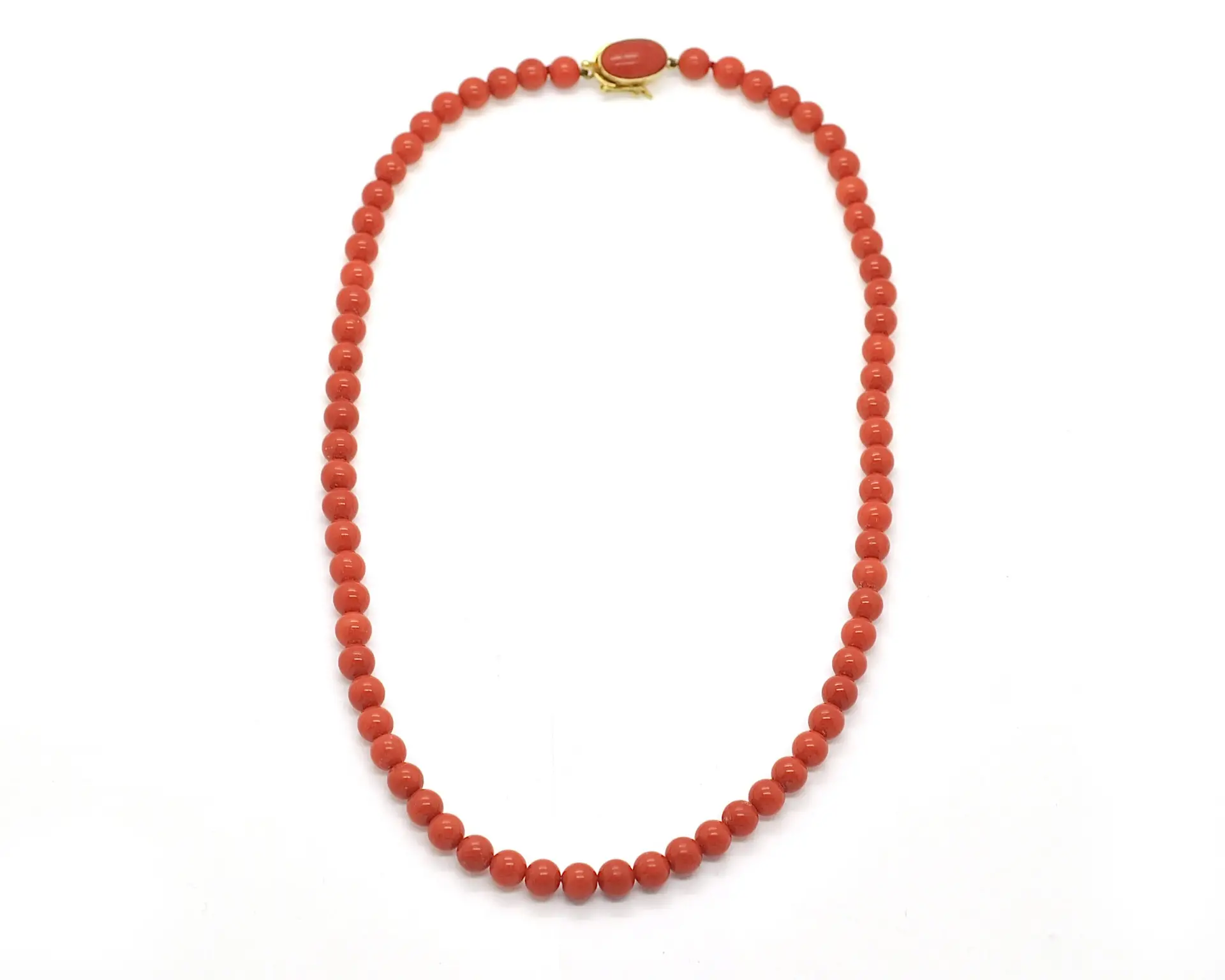 Bellissima collana di corallo, proveniente dai mari della Sardegna, dal peso di 34,5 grammi totali con chiusura in oro giallo 18 carati peso stimato 2 grammi. Diametro elementi 6,8mm/7mm.