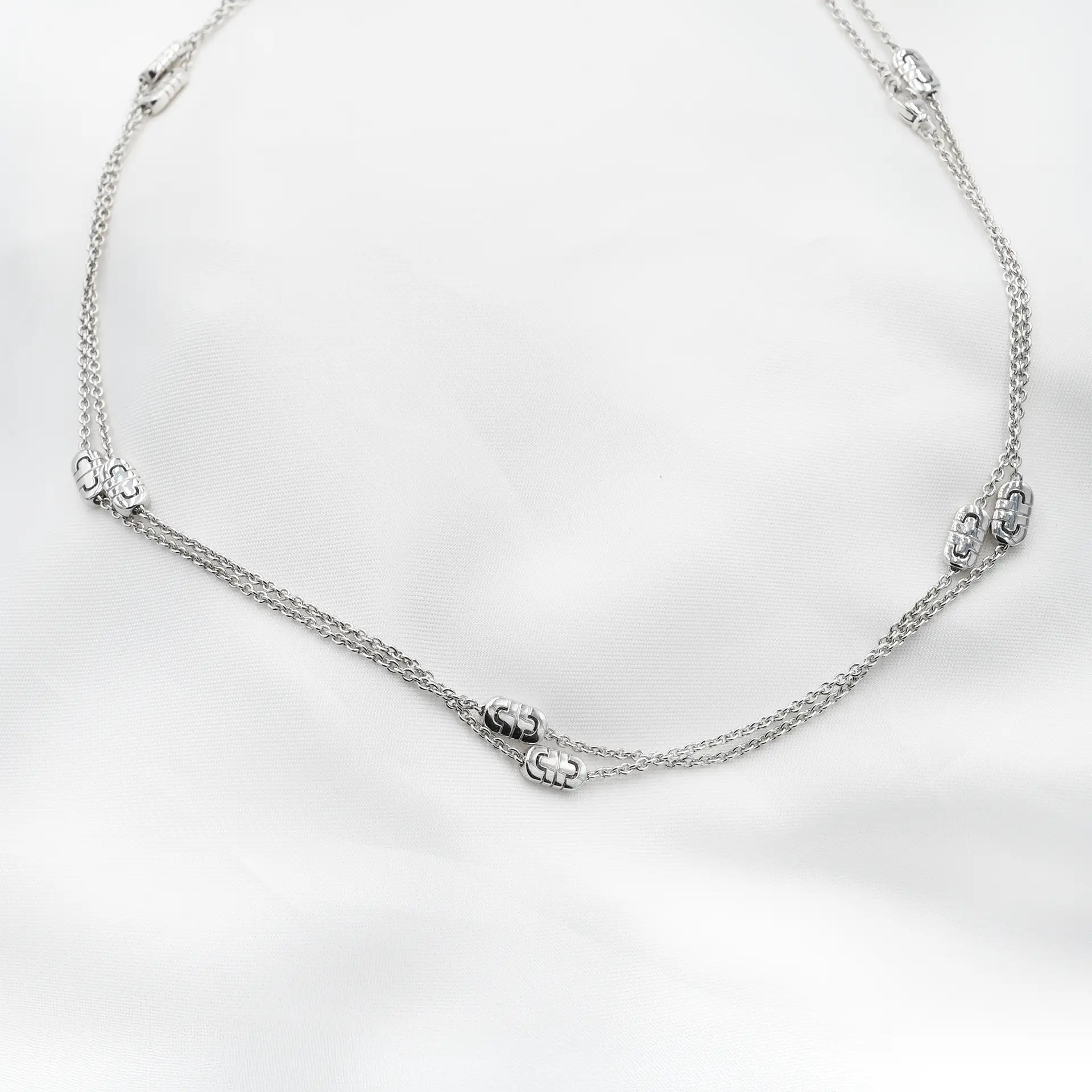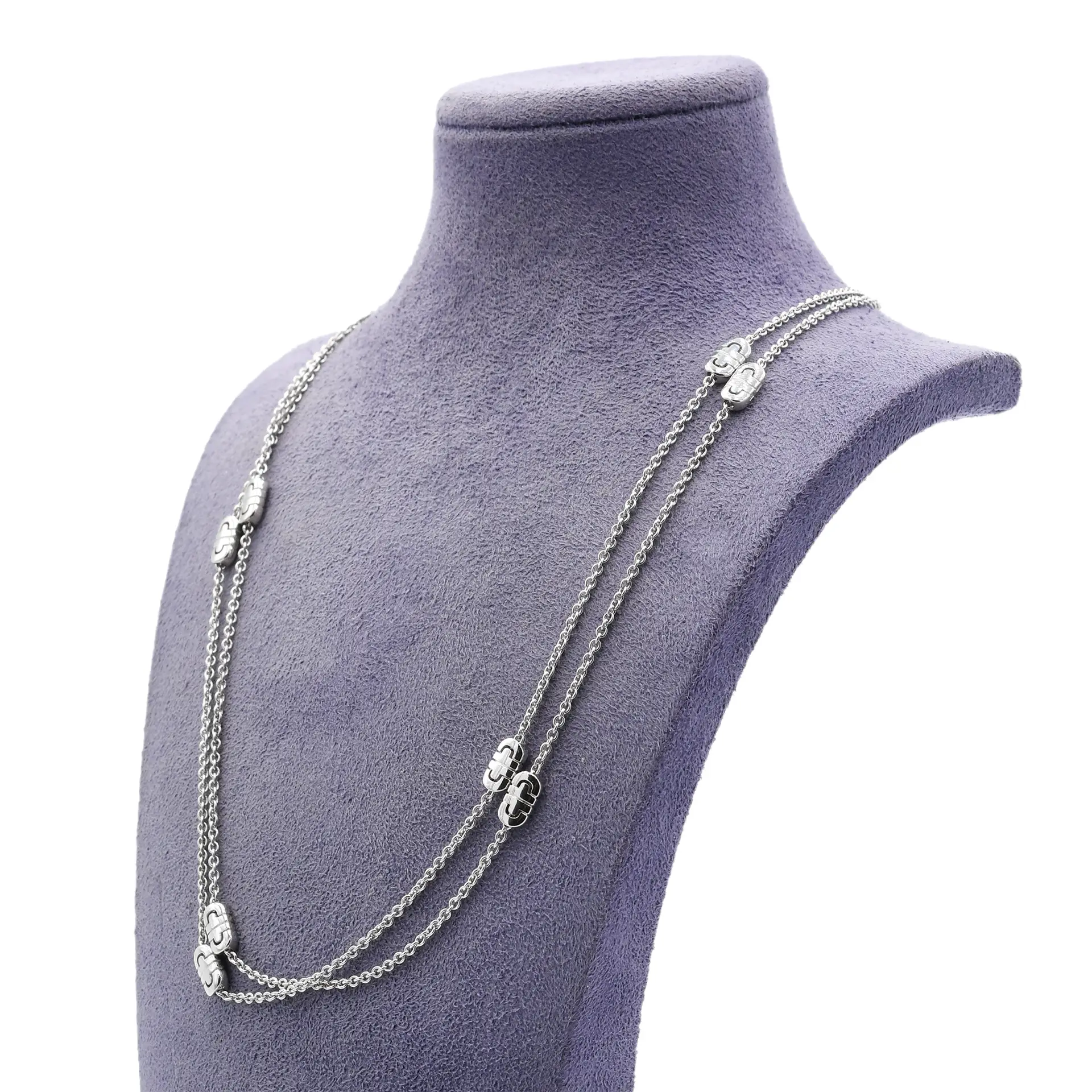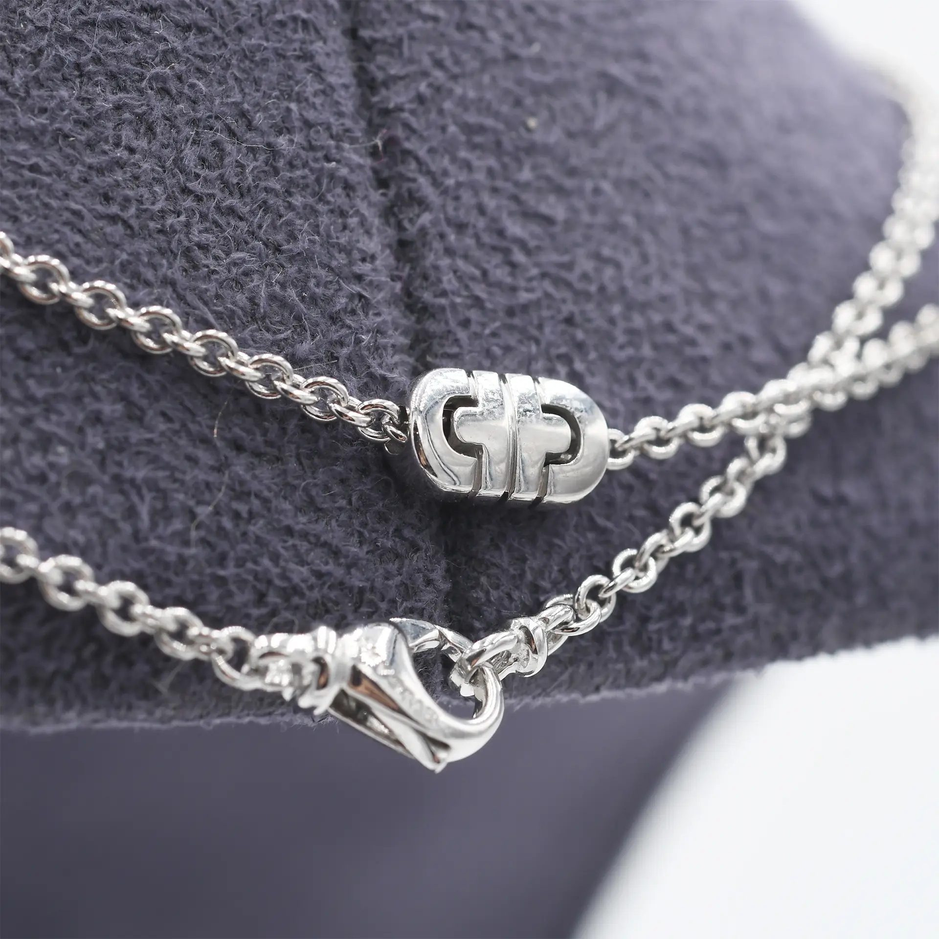 Icona di design e stile italiano, la collana Parentesi di Bulgari è realizzata in pregiato oro bianco 750 e pesa 20,8 grammi. La sua lunghezza di 90 cm permette di indossarla anche a doppio giro, offrendo versatilità e un tocco di sofisticata eleganza. Caratterizzata dalle inconfondibili maglie geometriche della celebre linea Parentesi, questa creazione unisce raffinatezza senza tempo e gusto contemporaneo. Un gioiello firmato Bulgari, perfetto per chi cerca classe, identità e lusso autentico.