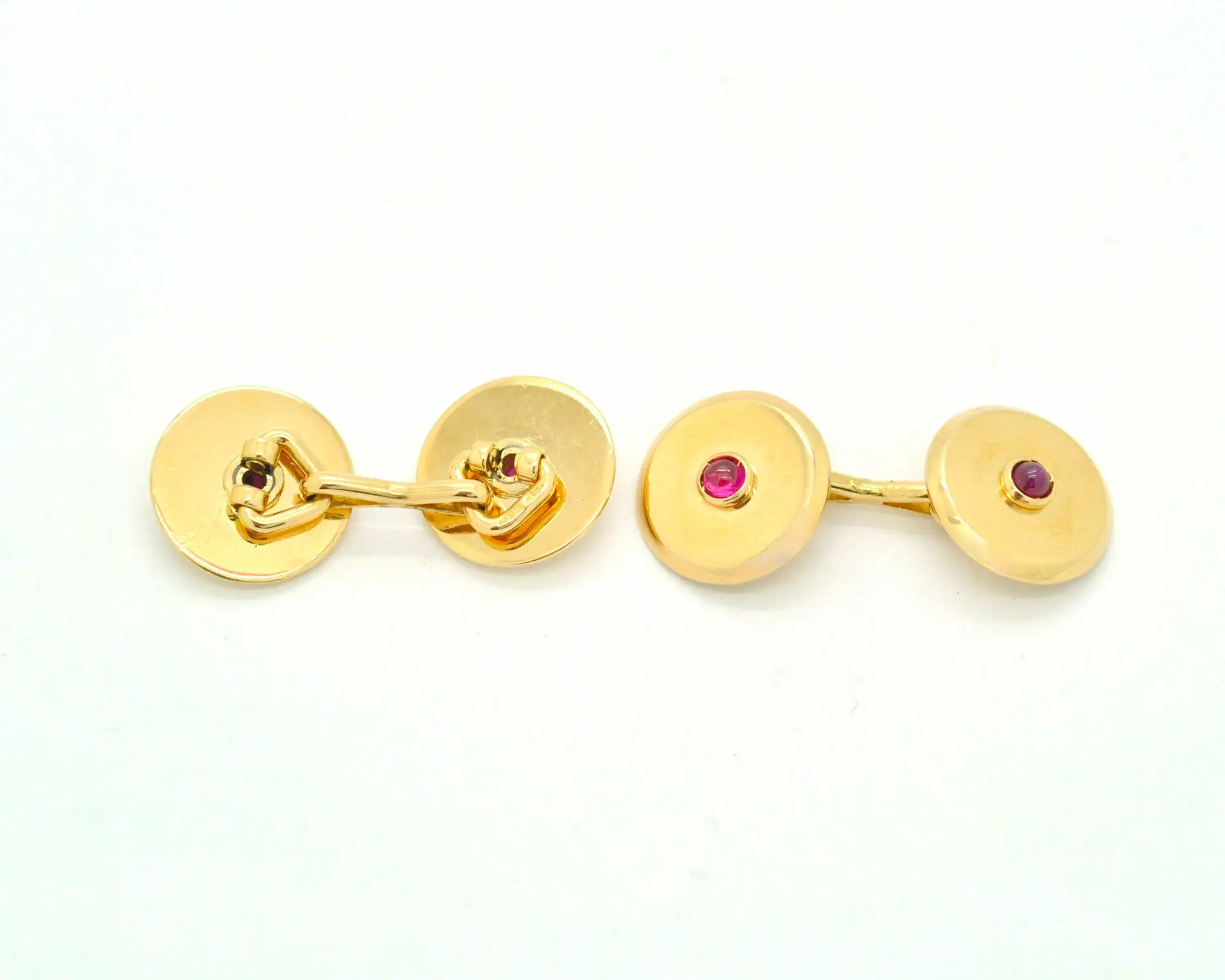 Raffinati gemelli in oro giallo 18 kt (750), dal peso complessivo di 13,1 grammi, impreziositi da eleganti rubini che donano un tocco di colore e prestigio. Lavorazione curata nei dettagli e materiali di alta qualità rendono questi gemelli un accessorio distintivo, perfetto per chi desidera esprimere stile e personalità con classe. Ideali per occasioni formali o come regalo esclusivo.