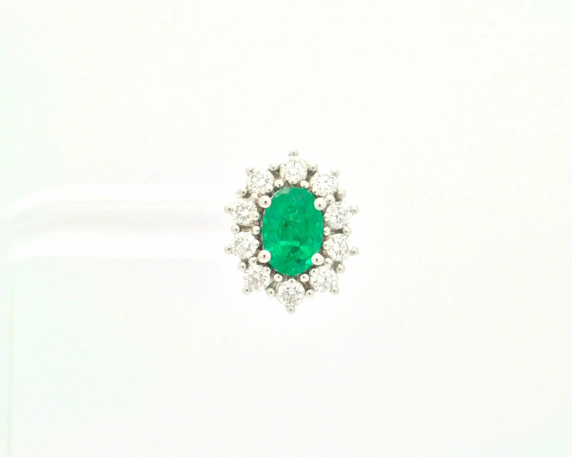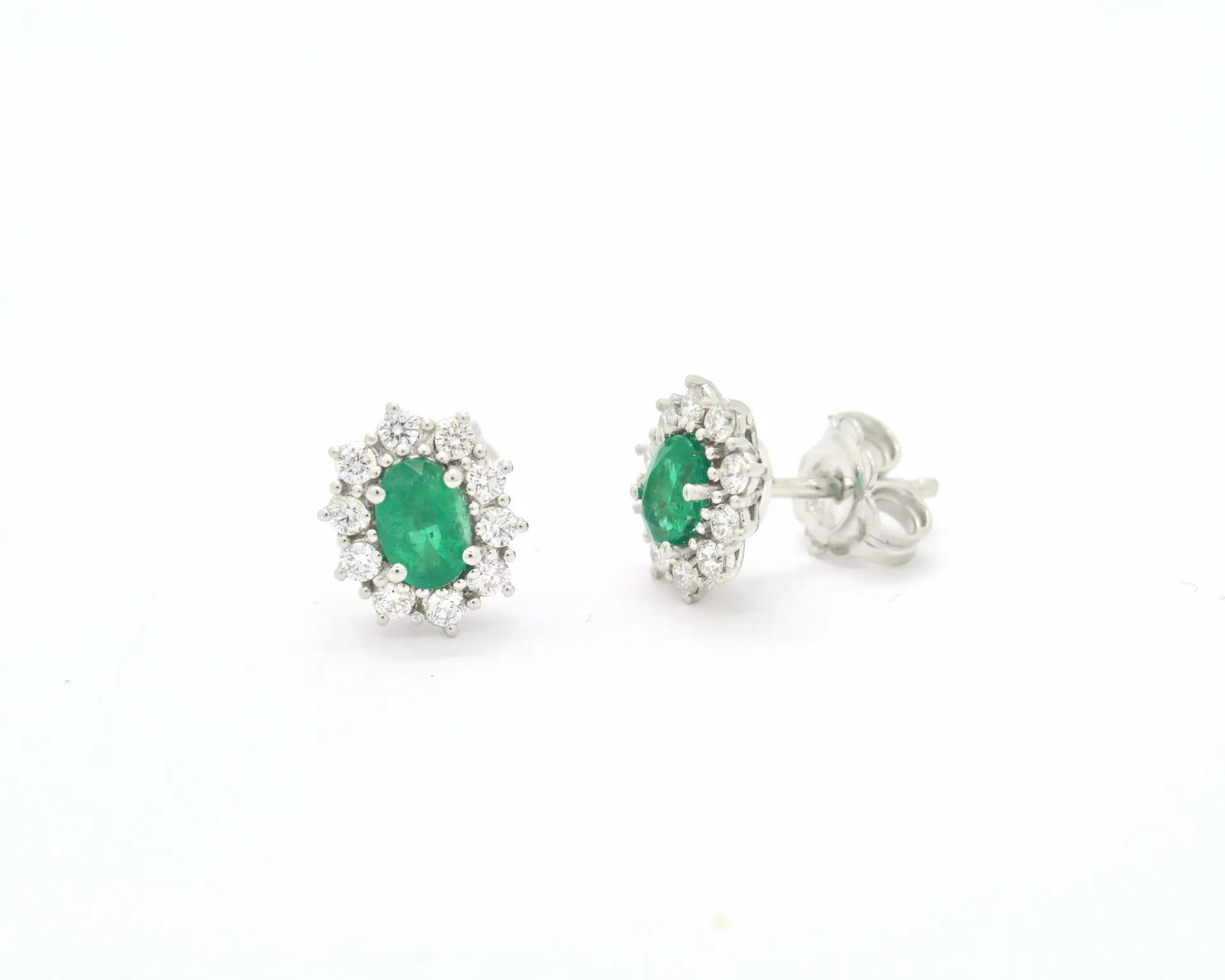 Orecchini in oro bianco Kt 750 di grammi 3. Con smeraldo Zambia di Ct 1,08 e diamanti di Ct 0,44 colore G, purezza VS.
