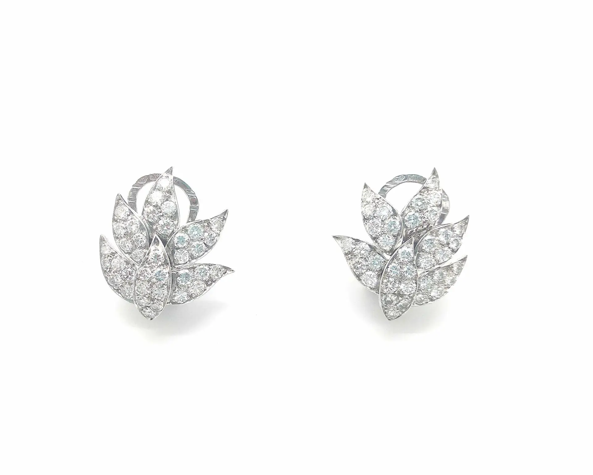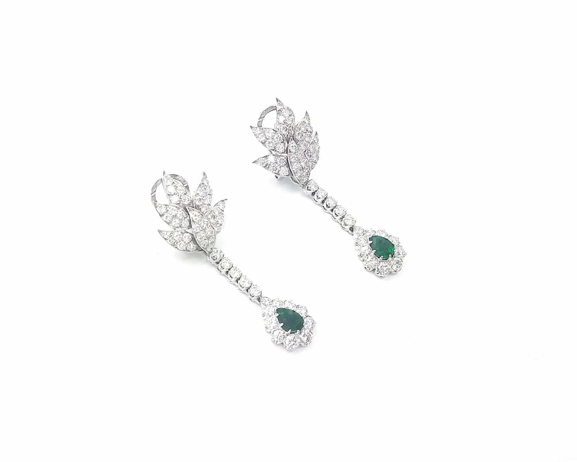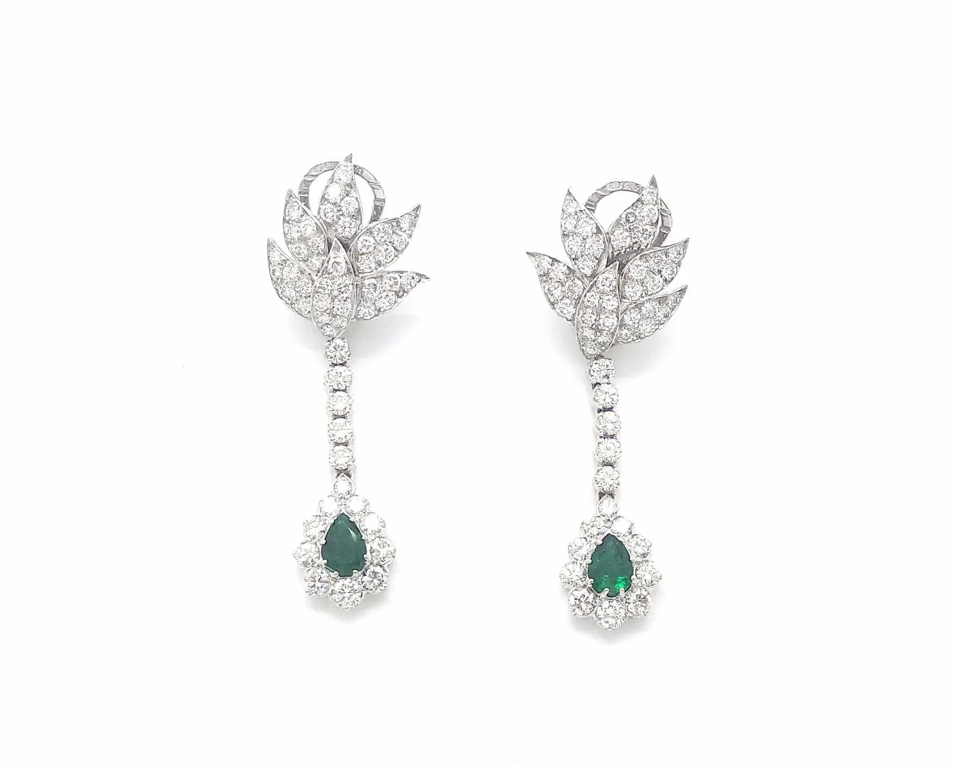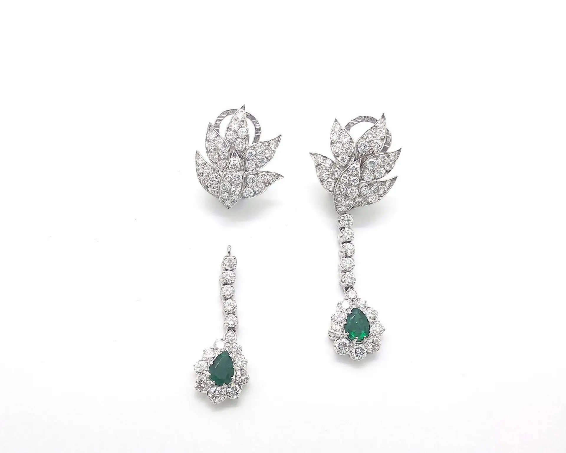 Orecchini scomponibili, in oro bianco 18KT la parte inferiore e 14kt la parte superiore, del peso di gr. 11. Con diamanti CT stimati 3,30 di colore G e purezza VS. Smeraldi provenienza Brasile CT totali stimati 1.