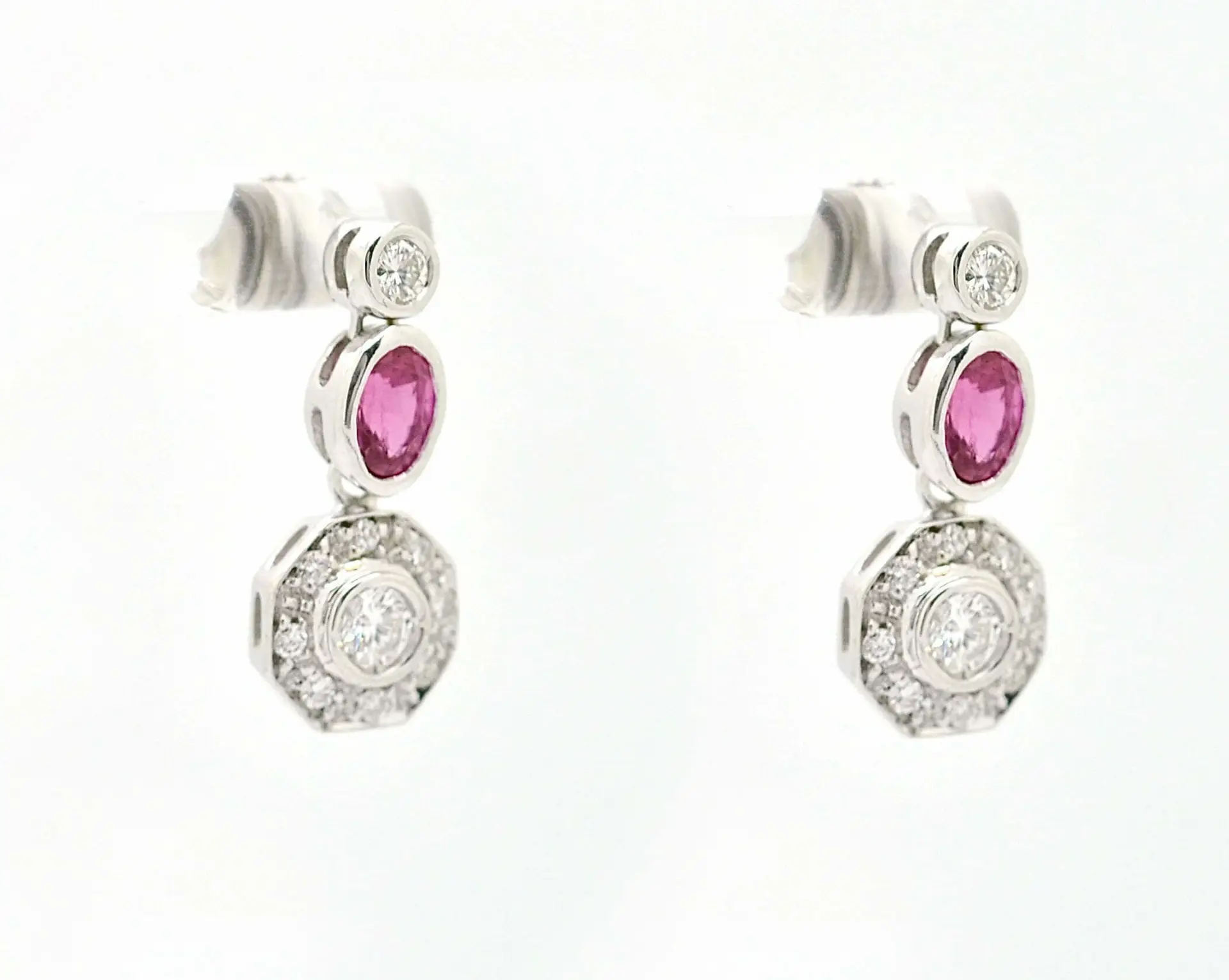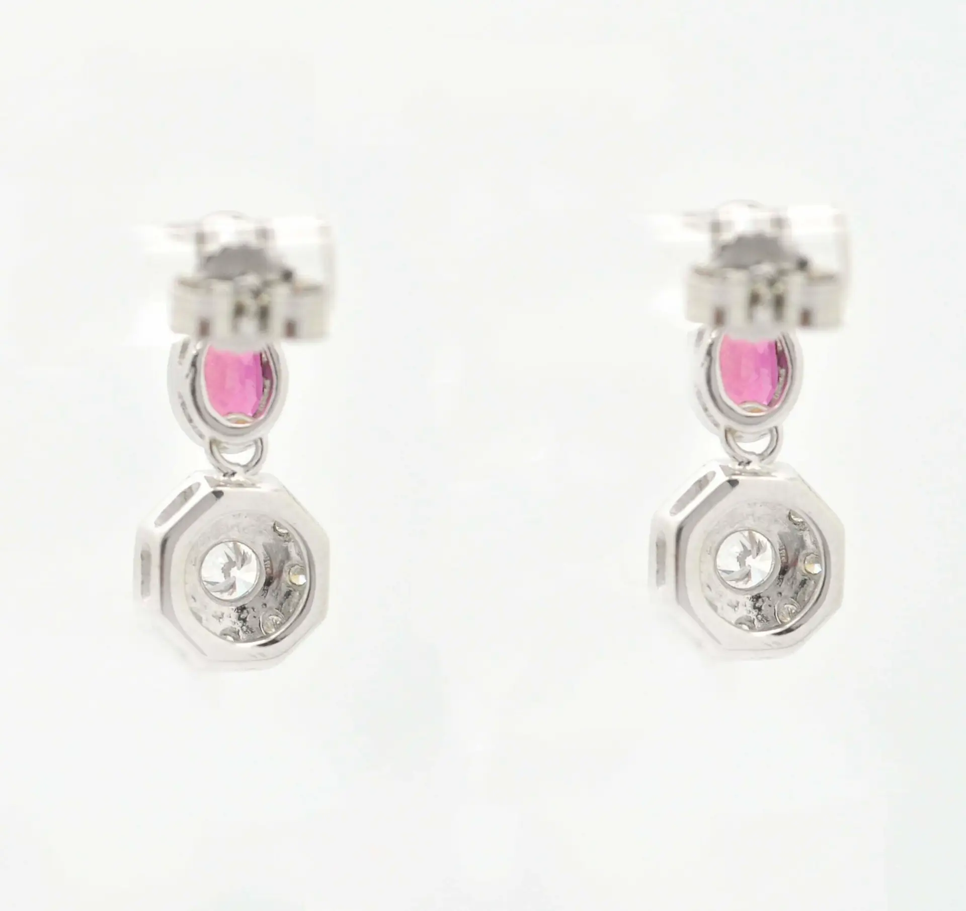 Orecchini in oro bianco ct 750, peso gr. 4,8. Con rubini ct 1 e diamanti ct 0,76 colore G purezza Vs.